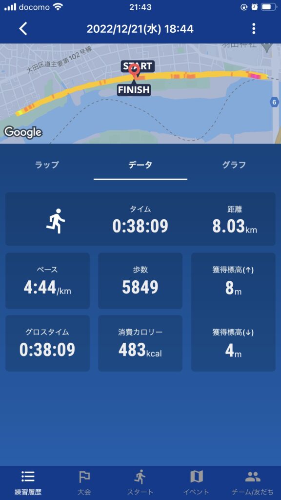 日記 ランニング ランニング12月24日 日記 2022.12.25 今朝は、風が強い予報でしたので目標を10キロに変更しました。向かい風でペースが上がらず苦しみましたが、何とか完走できました。今日までの12月の総距離は140キロです。残り7日、27日にはコロナワクチン接種予定で副反応次第ですが、200キロは達成したいなと思います。 以下の画像は、帰宅後のランです。 12月19日(月) 距離:8キロ 時間:37分39秒12月21日(水) 距離:8キロ 時間:38分9秒12月22日(木)[午後休]距離:10キロ 時間:51分41秒